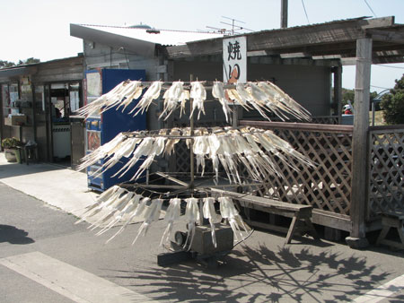 蝿がつかないよう、グルングルン回しながら一夜干しを作っている。