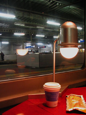 コンパートメントに乗り込み、机を開いて、コーヒーとおつまみ。