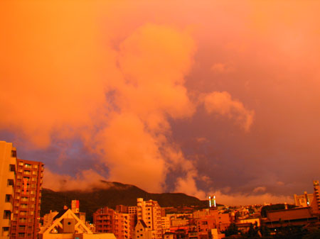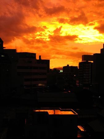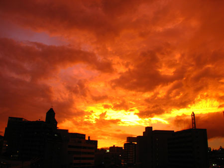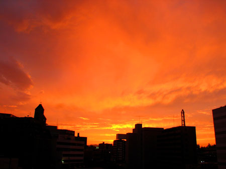 建物が真っ赤に染まり、「ナンですかこれは!」な夕景。