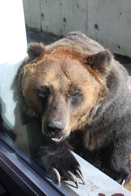 パイプから餌を落とそうとすると、鼻息荒く近づいてくるヒグマ。