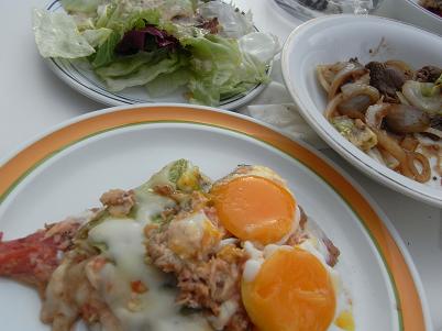 ピザ風に、卵やチーズ、トマトをたっぷり乗せて、焼いてくれたもの。