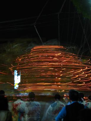 ホラ貝を鳴らし、鉦や太鼓を叩きながら、クルクルと回るのが