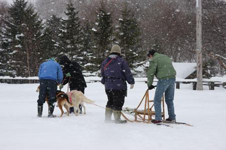 犬ぞりで転んだ時に首を痛めたらしいおじ様は、見てるだけ。