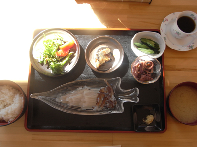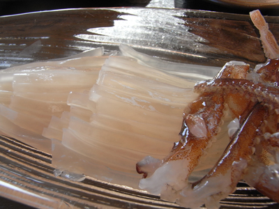 活いかの刺身、イカのゴロ煮(ワタ煮)、さんまの煮付け、