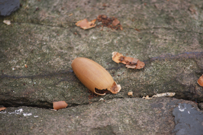 巣に戻り、葉っぱを敷いたら、次はどんぐり。